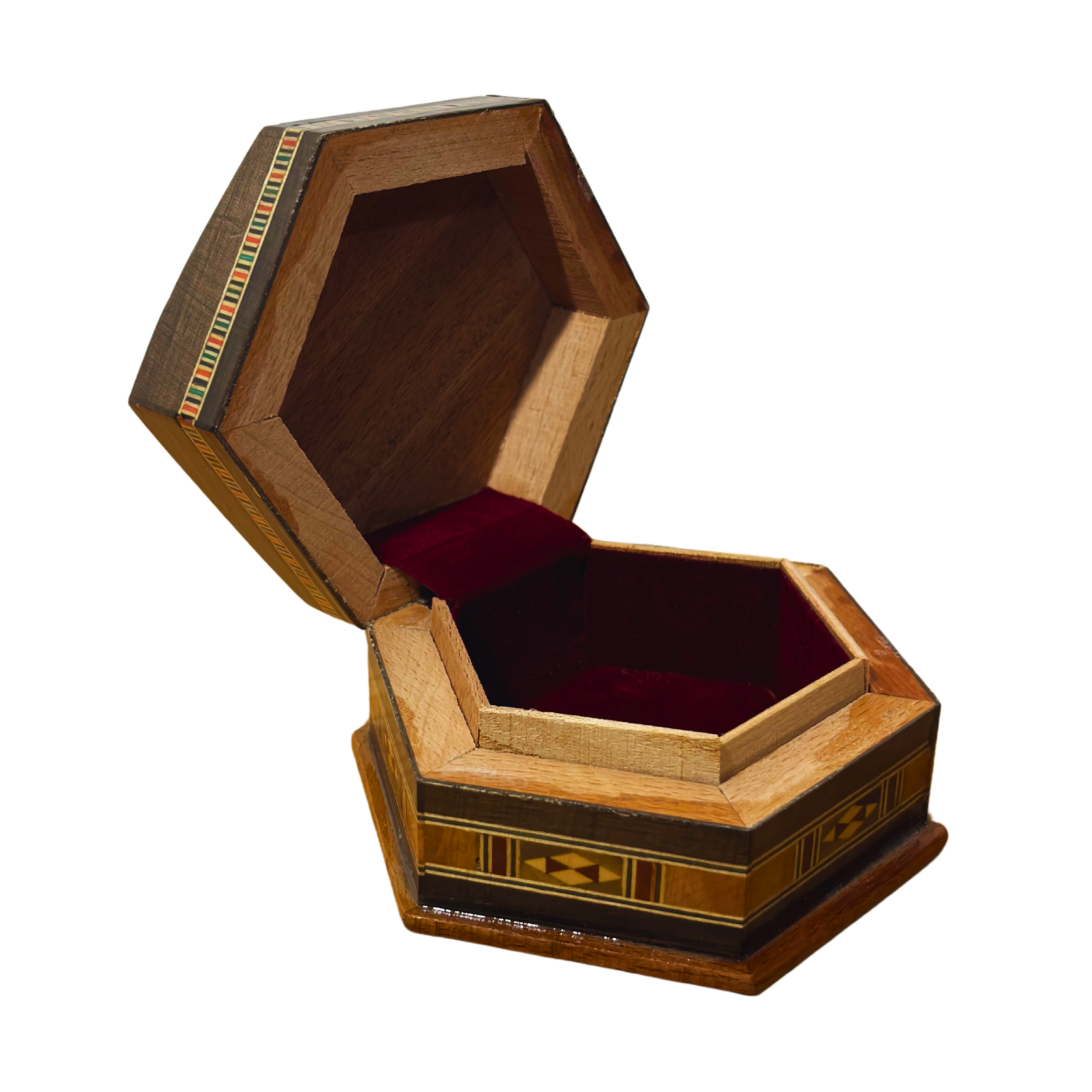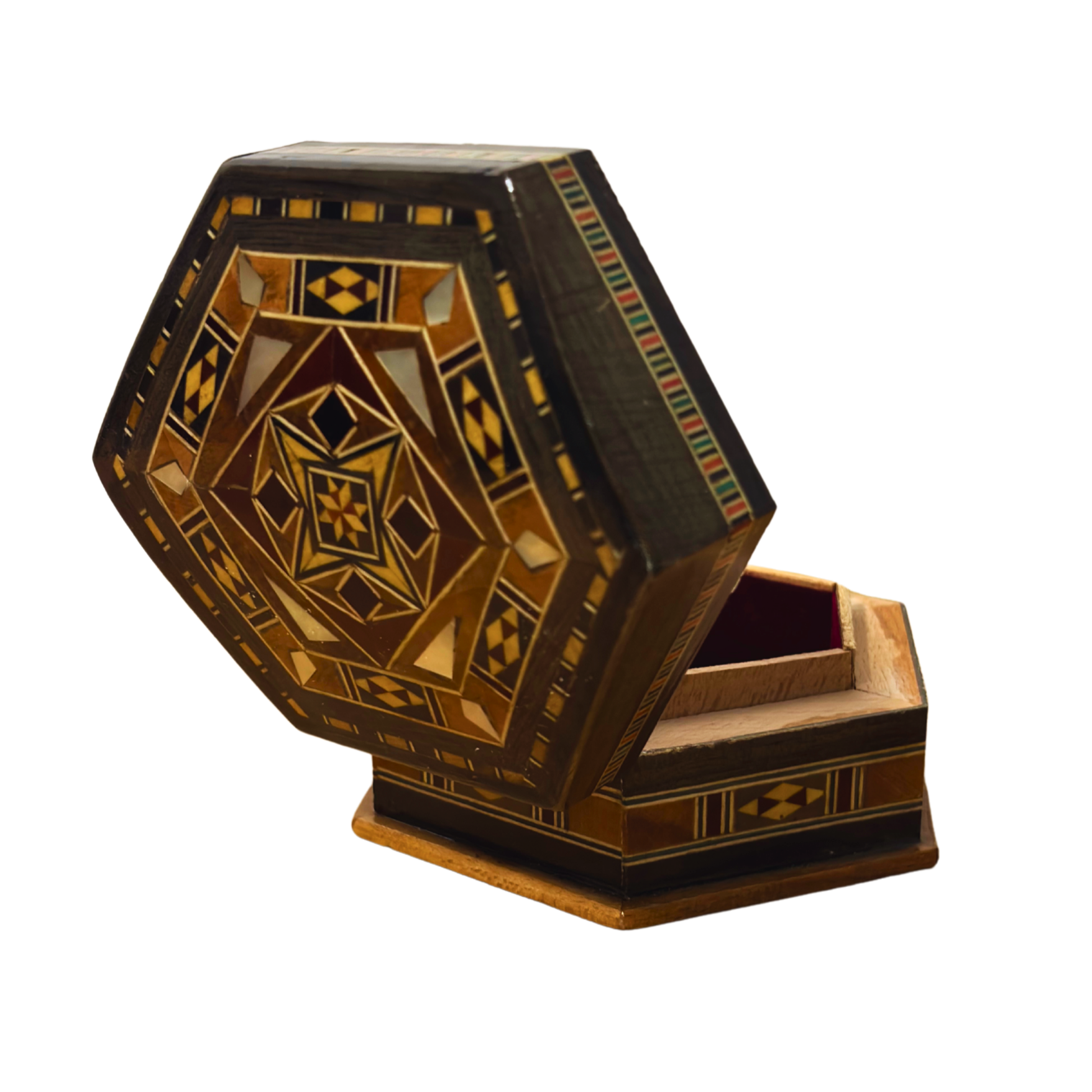 Mosaikschatulle aus Damaskus, handgefertigte Holzbox, orientalische Mosaikkunst, sechseckige Schatulle, syrisches Handwerk, Damascus Box