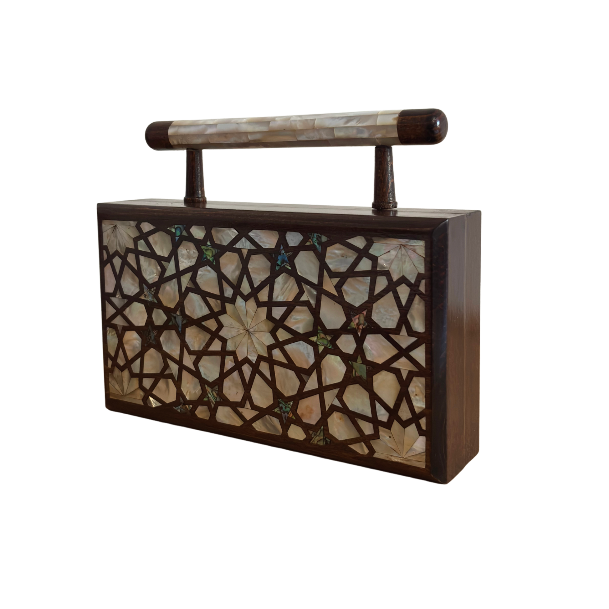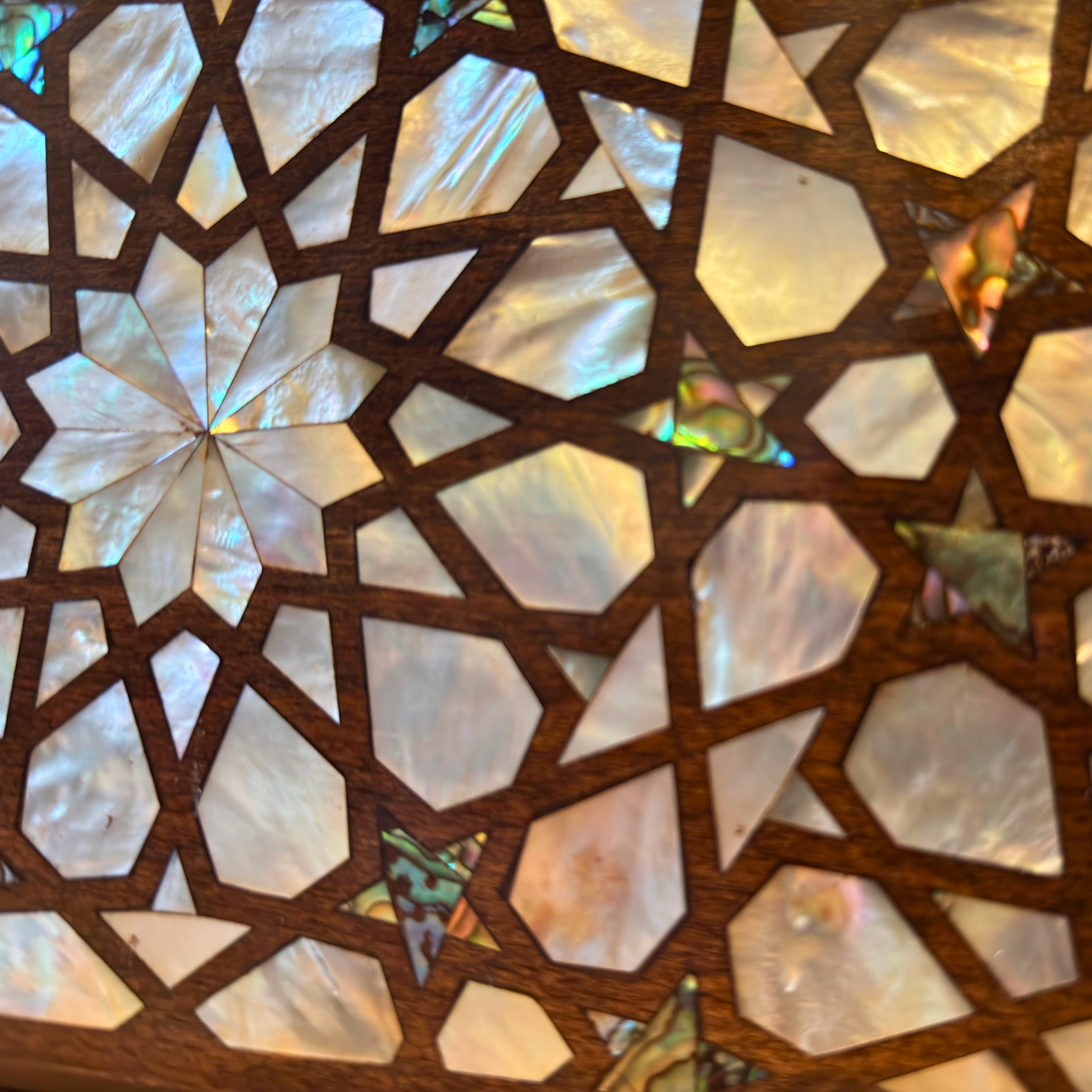 Realizzata in legno di noce pregiato e decorata con intarsi a stella in madreperla, riflette l’arte siriana tradizionale.