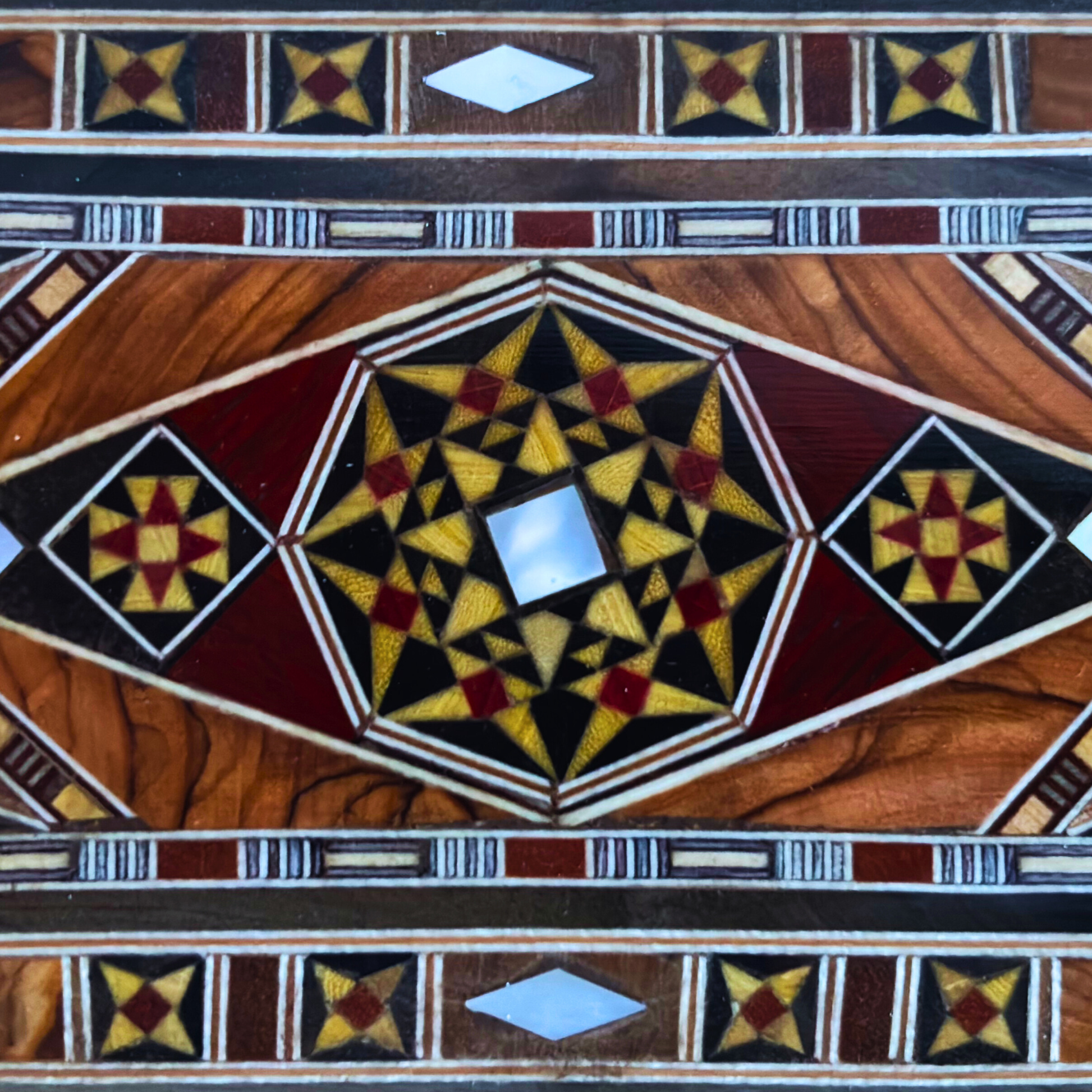 Esalta il tuo spazio con questa splendida scatola in mosaico damascato realizzata a mano, dalla forma allungata e rettangolare, pratica e artistica al tempo stesso. Realizzata con cura da abili artigiani utilizzando legni di noce, faggio, limone e pino giallo, e intarsiata con luminosa madreperla , questa scatola presenta motivi a mosaico geometrici tradizionali ispirati all'arte siriana.