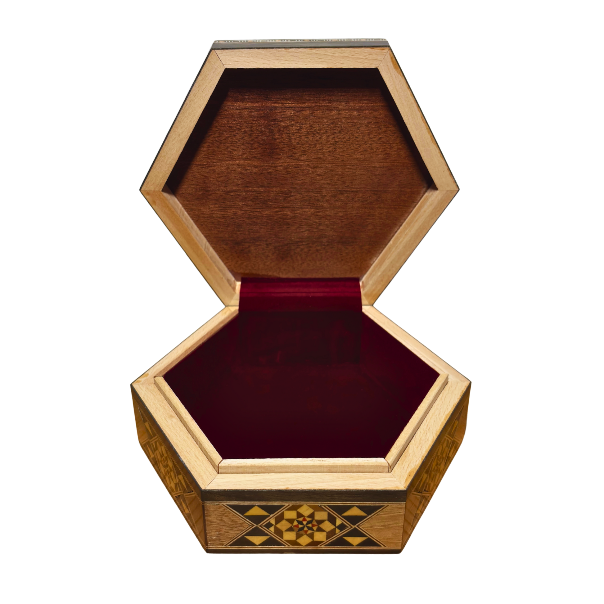 Realizzata a mano con noce, faggio, legno di rosa e legno di limone, questa scatola damascena presenta raffinate intarsiature in vera madreperla e un’estetica di alta artigianalità.