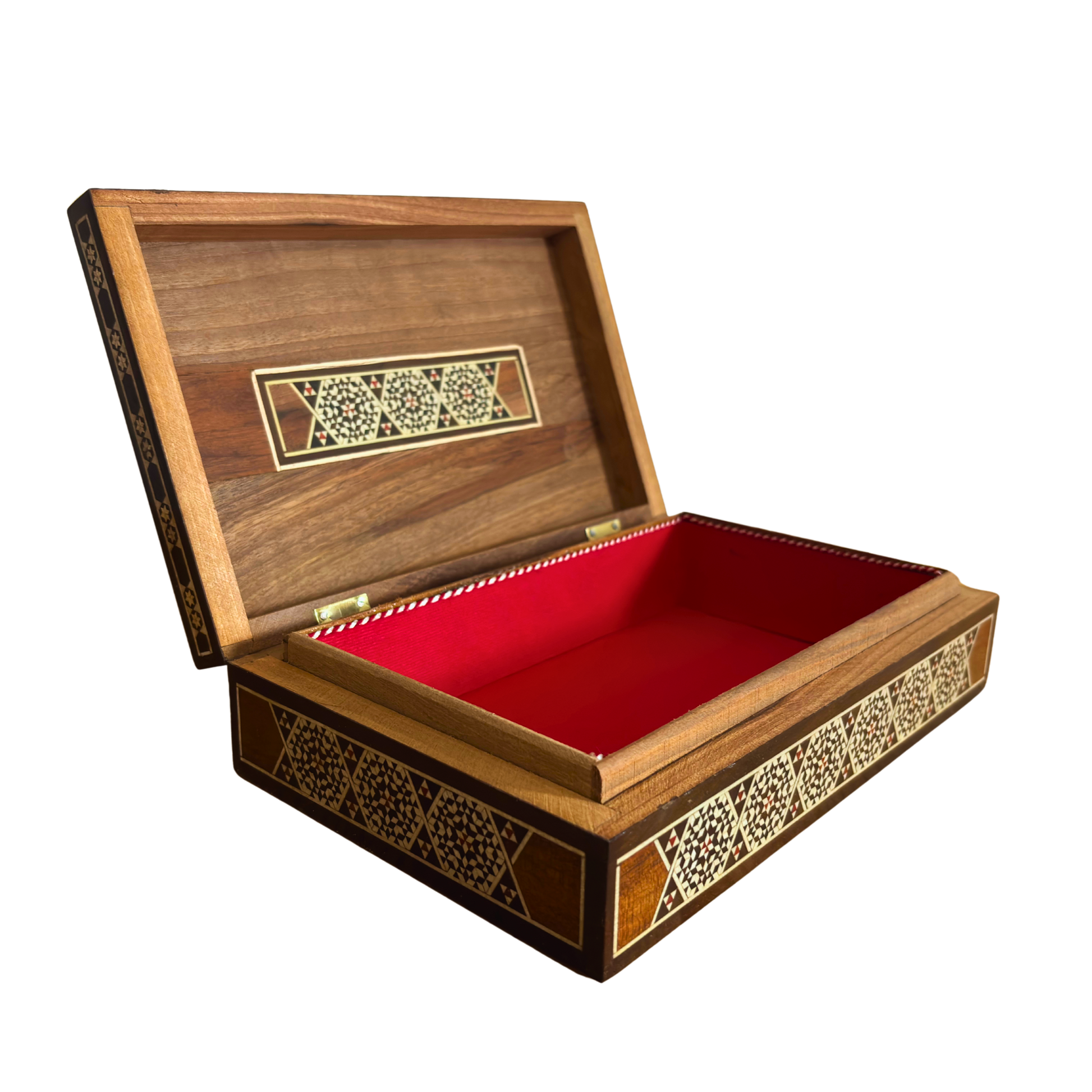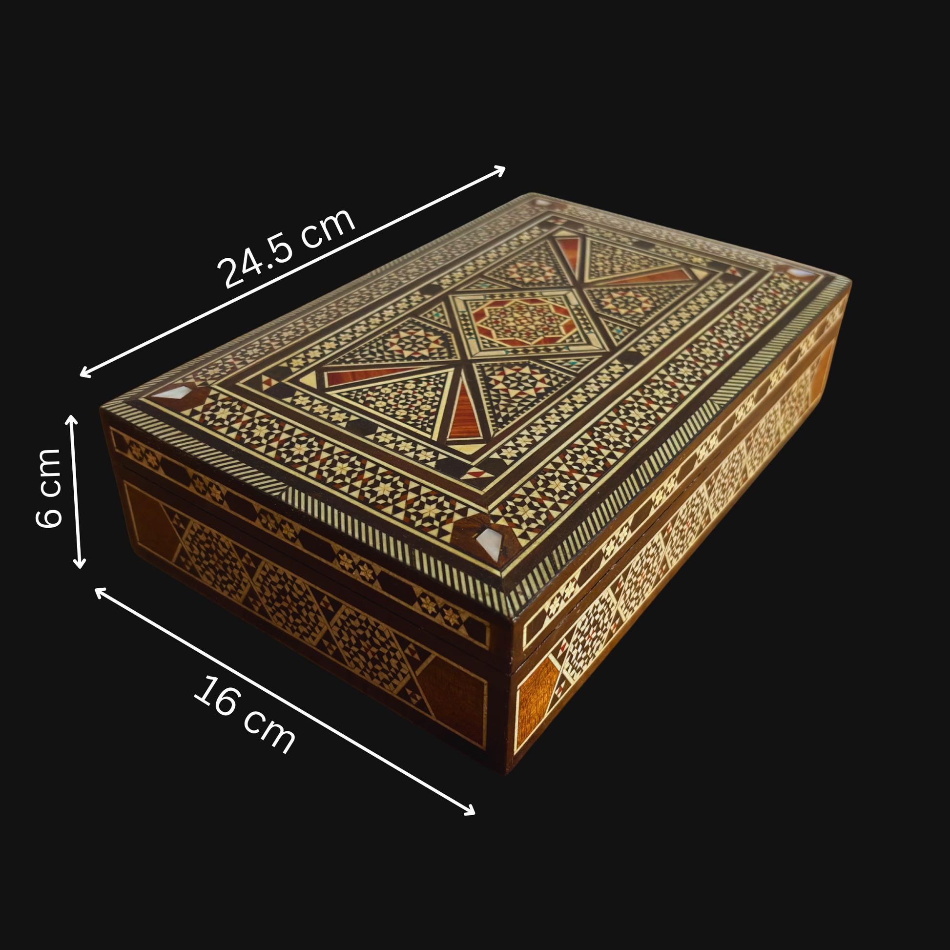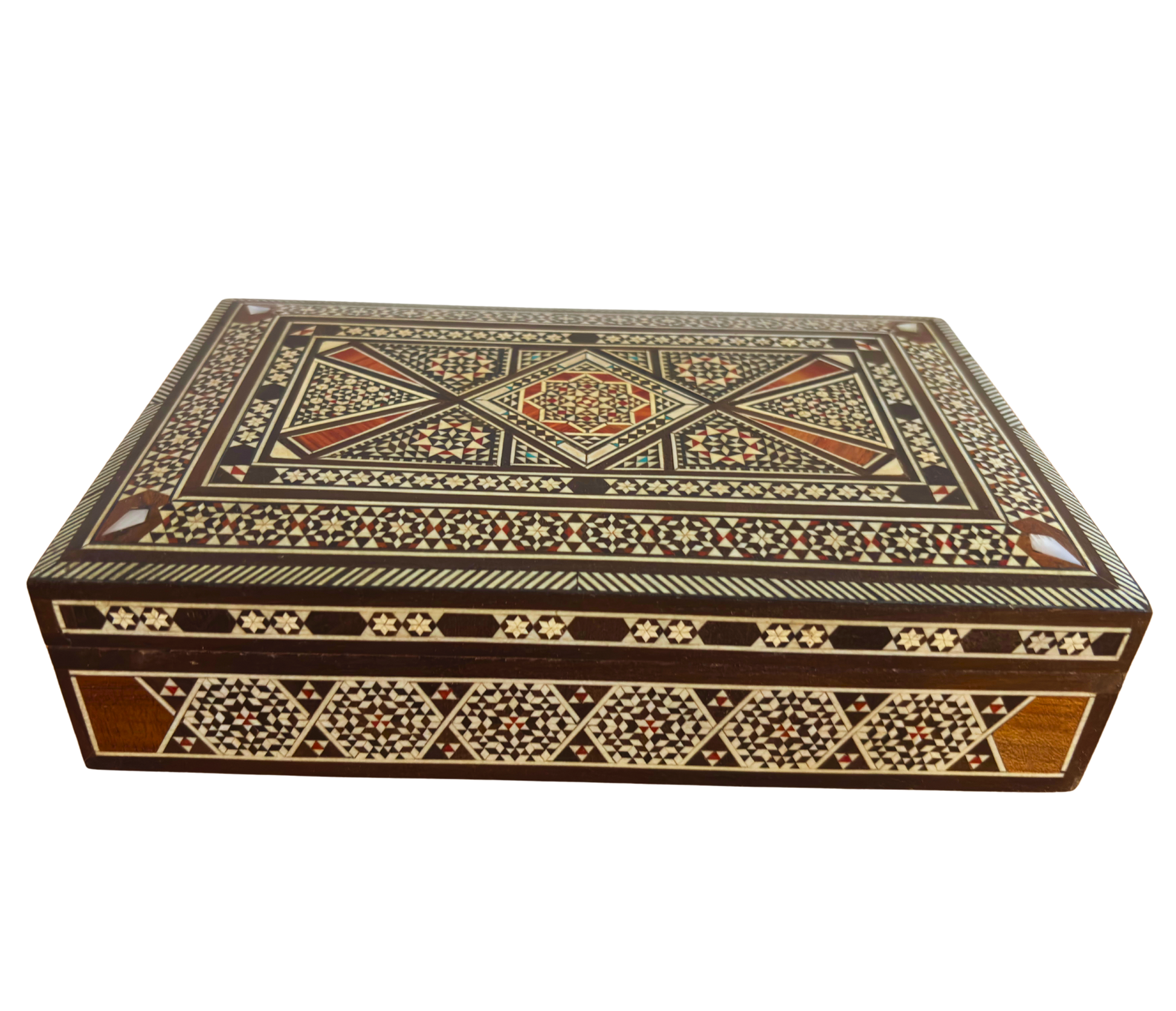 Scatola vintage in mosaico damascato, portagioie fatto a mano, scatola in legno di madreperla, baule portaoggetti in mosaico siriano, scatola con intarsi orientali, arredamento vintage anni '70, regalo per lei, regalo di anniversario unico, arte mediorientale fatta a mano, scatola del tesoro in legno, scatola di Damasco, scatola siriana, regalo per lui