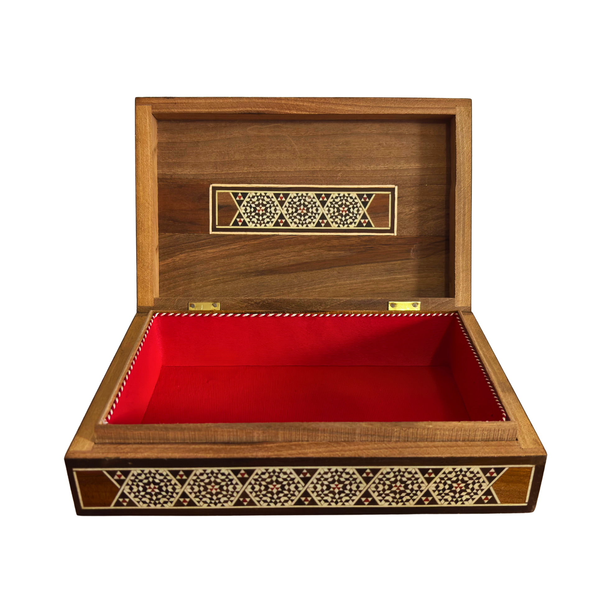 Cattura il fascino dell'artigianato mediorientale con questa scatola vintage in mosaico damascato del 1970. Sapientemente realizzata in legno di noce, faggio, limone e pino giallo, questa scatola portagioie in legno presenta delicati intarsi in madreperla in un ricco e intricato motivo a mosaico che riflette secoli di tradizione artistica.