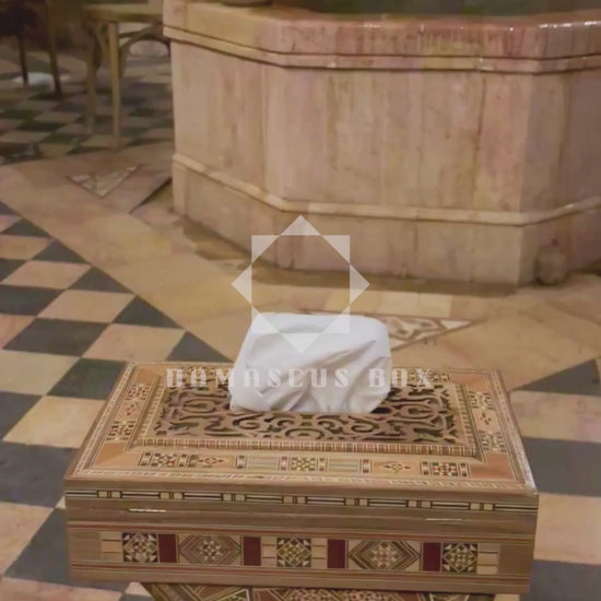 Questo raffinato portafazzoletti in legno fatto a mano riflette la tradizione e l’armonia dell’arte del legno di Damasco.