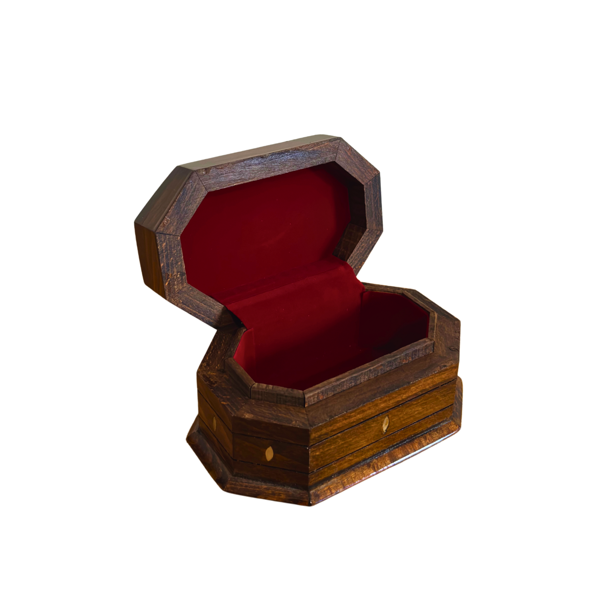 The interior is lined with luxurious wine-red velvet, adding a touch of refinement while protecting your precious items.