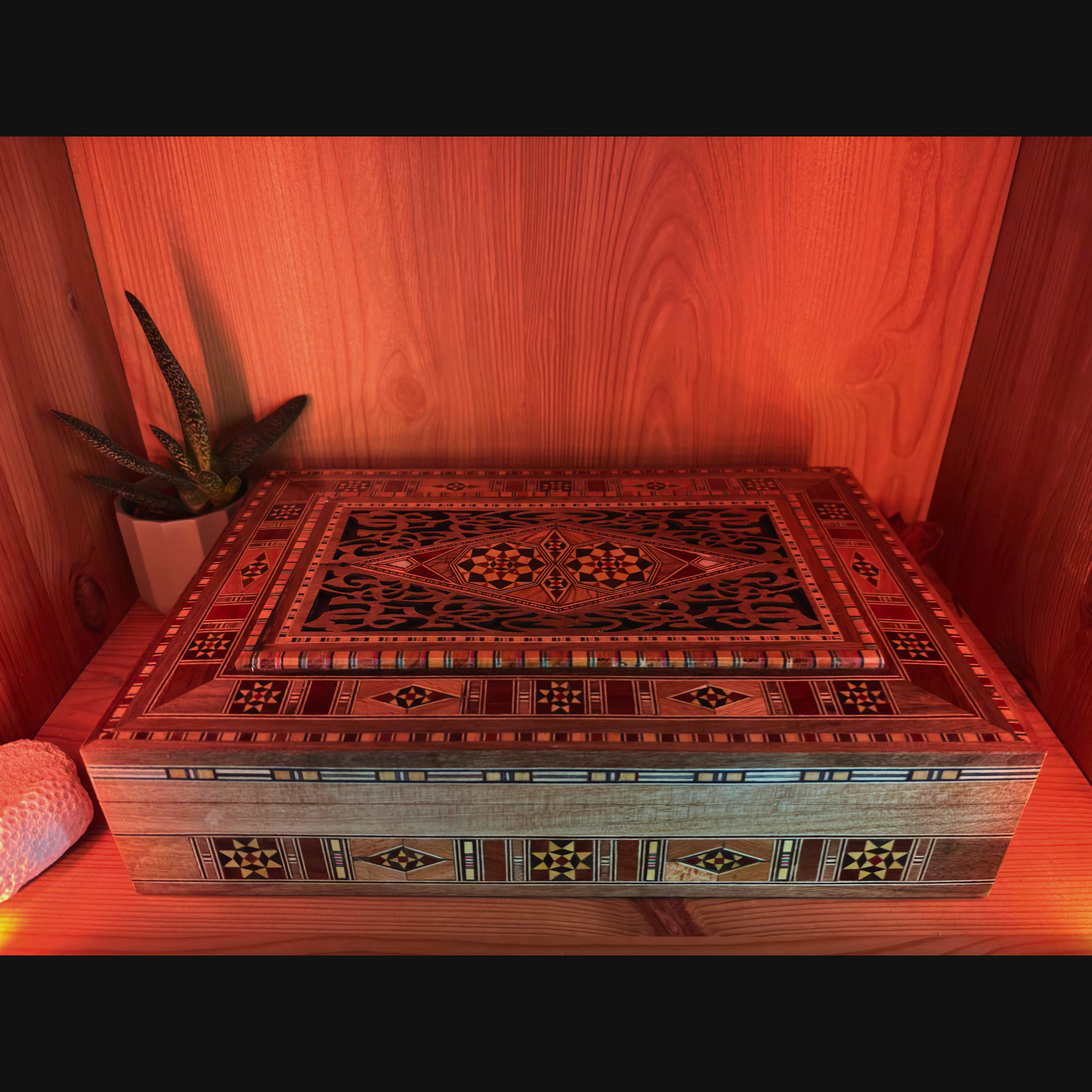 Experience the elegance of traditional Damascus craftsmanship with this large rectangular mosaic box, meticulously handmade from premium Eucalyptus, walnut, lemon, Rose and beechwood. Designed for those who appreciate refined artistry and timeless design, this box is perfect for safely storing jewelry, watches, cigars, delicate keepsakes, or treasured mementos.