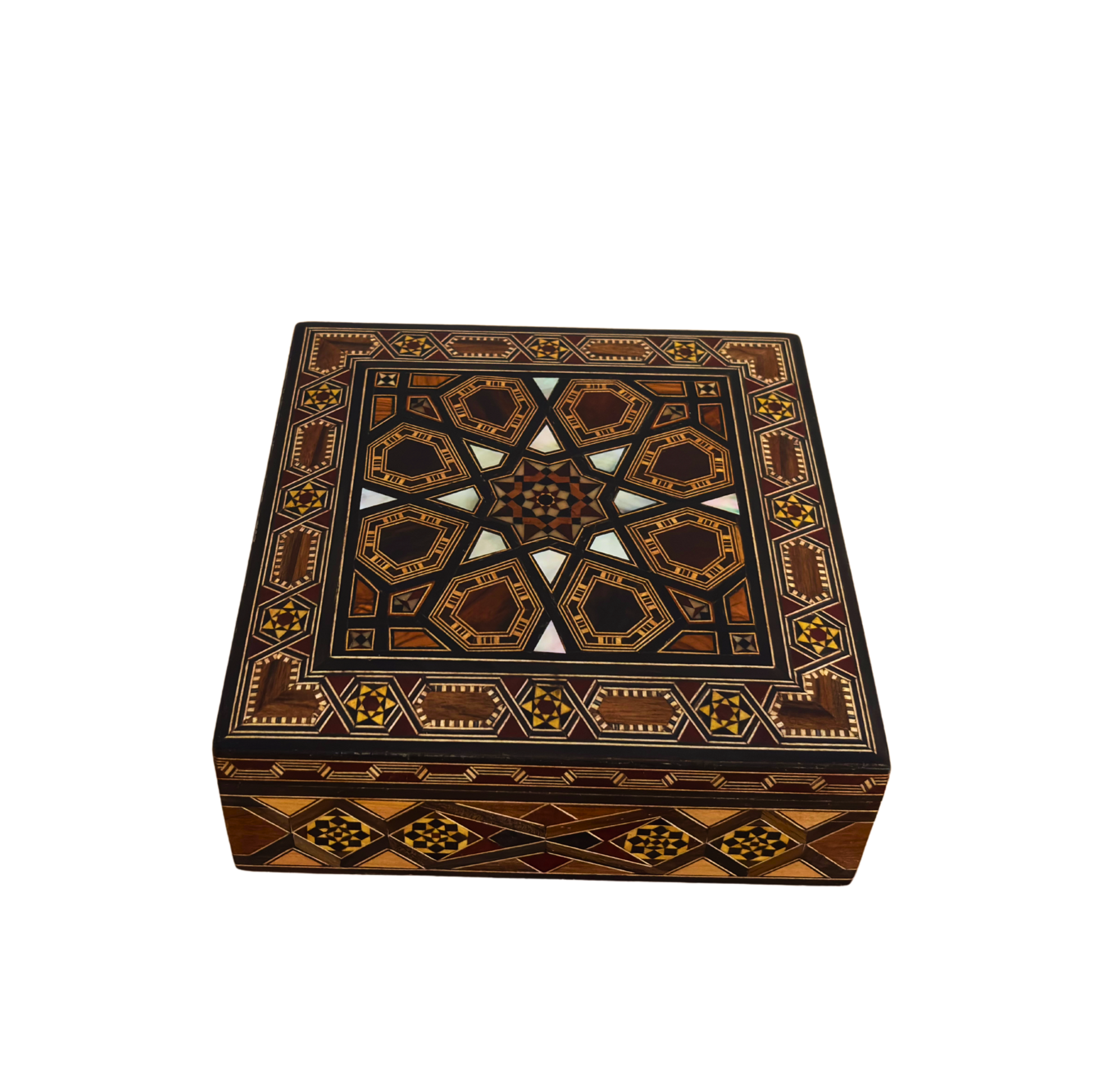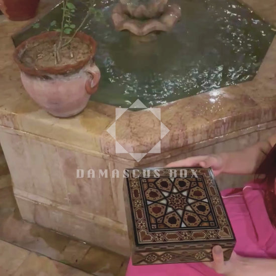 Damascene mosaic box, Gaby Al Dayeh, handcrafted mother of pearl box, oriental wooden box, Syrian craftsmanship, velvet-lined jewelry box, Damascus mosaic art, luxury handmade gift, Damascus Box