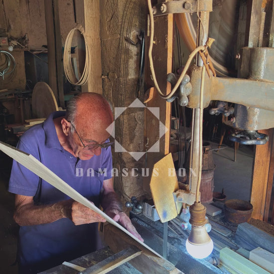 This elegant Damascene mosaic box is the creation of Gaby Al Dayeh, the renowned 90-year-old master craftsman celebrated as the king of the Damascene mosaic art. With over 75 years of experience, each piece he produces carries a legacy of precision, devotion, and artistic mastery.