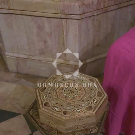 Damascene octagonal box, handcrafted wooden box, oriental mosaic, Syrian art, wine-red velvet interior, unique gift, Damascus Box