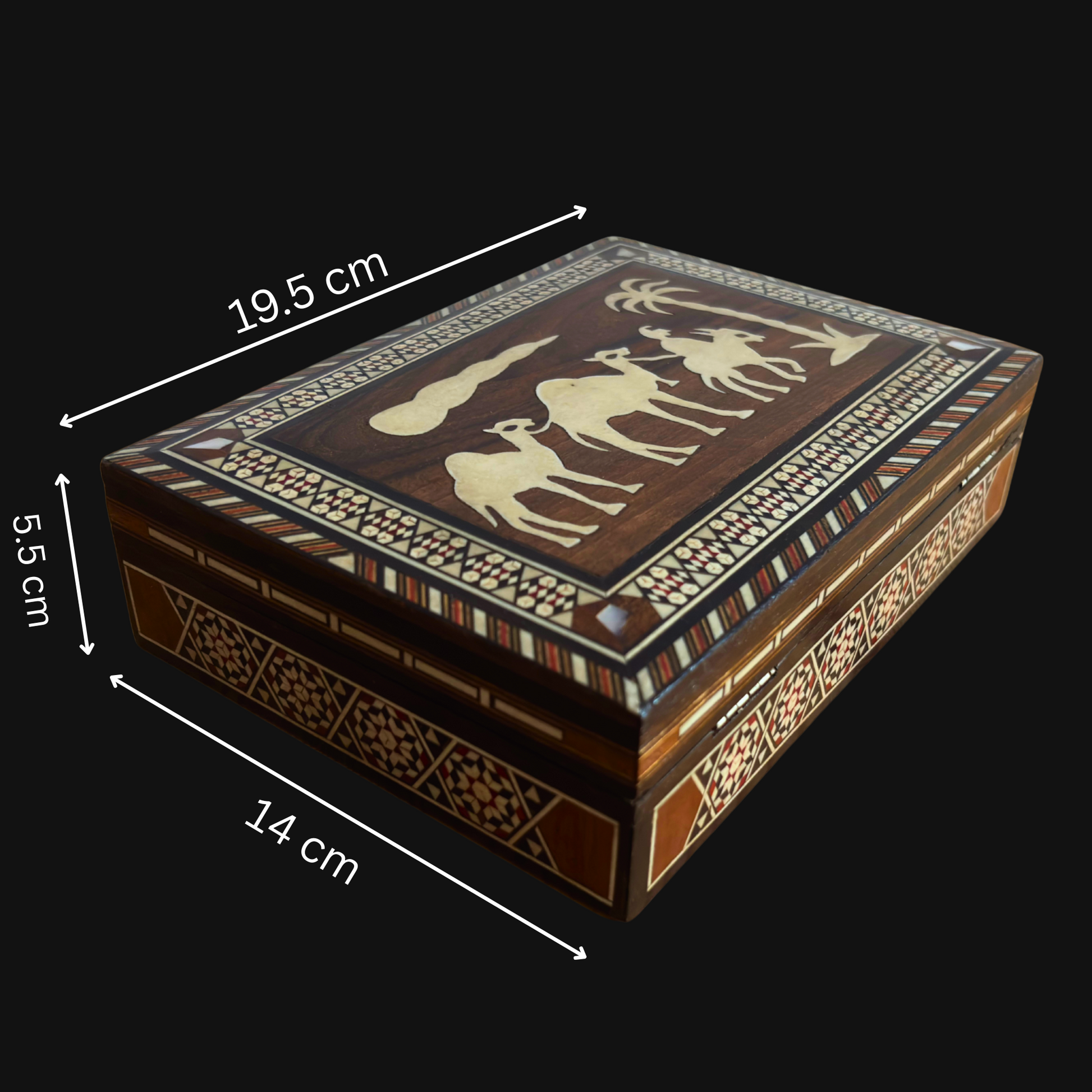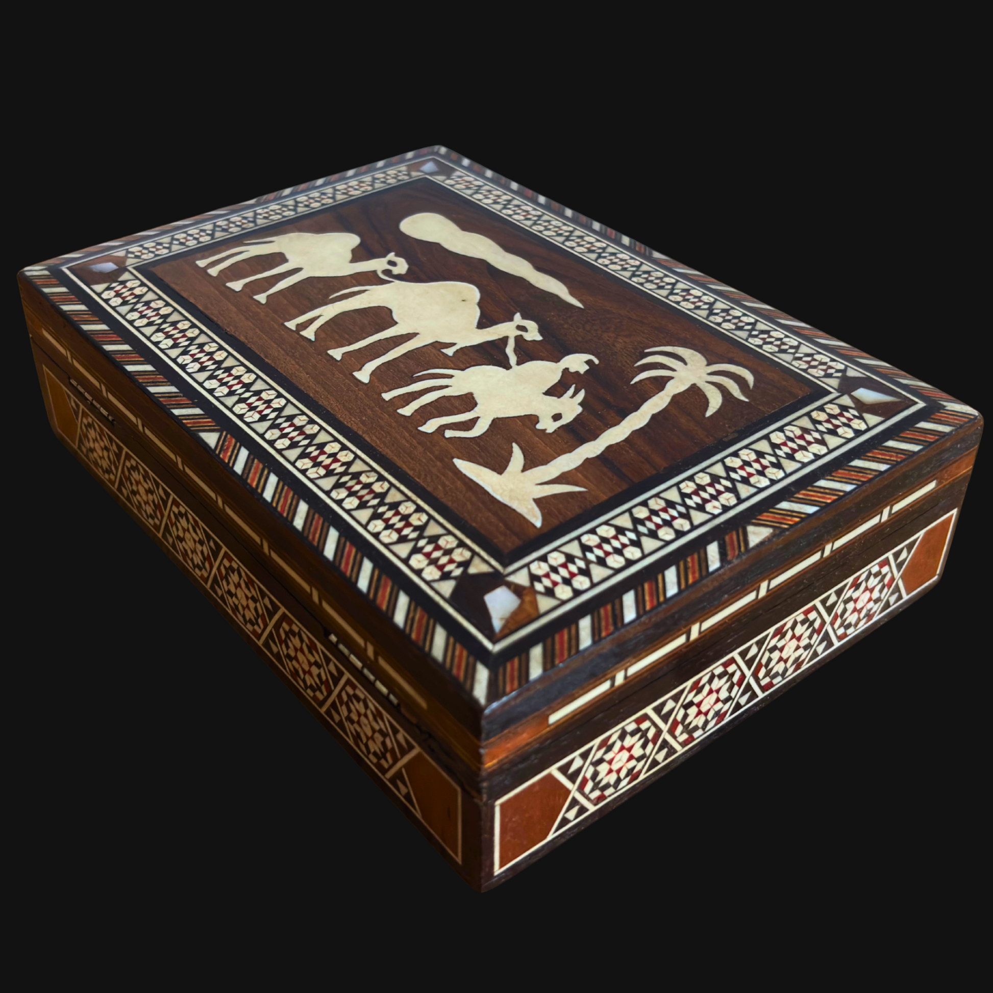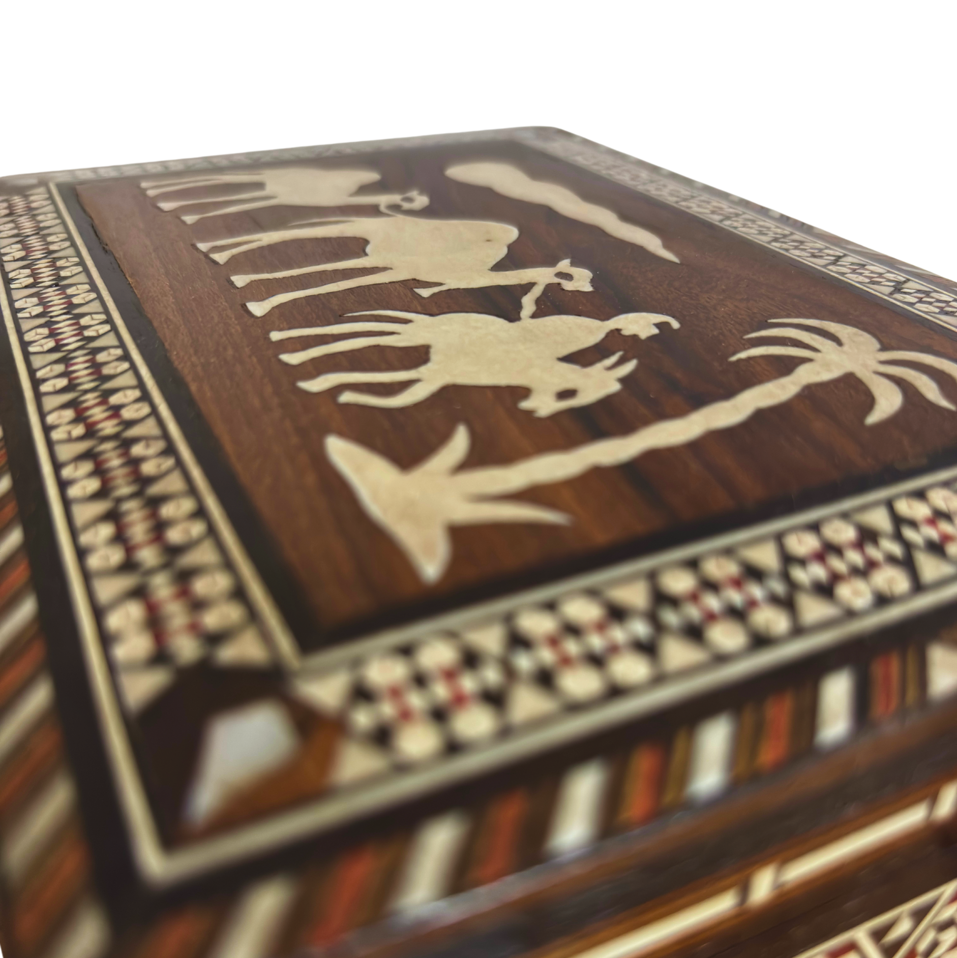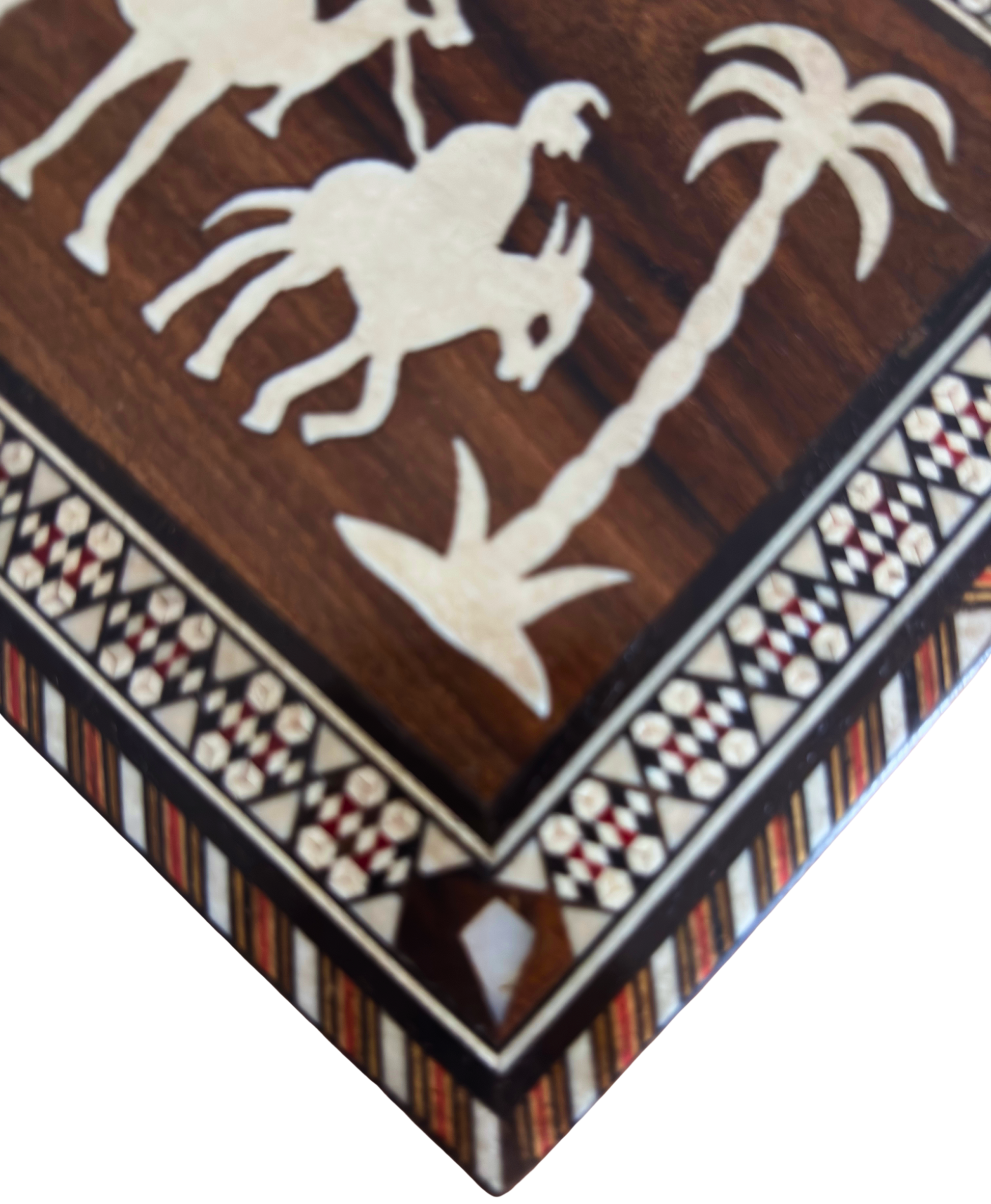 caixa vintage de mosaico com camelo, caixa de madeira damascena 1970, caixa artesanal de madrepérola, cena beduína do deserto, lembrança mosaico síria, decoração vintage do Oriente Médio, presente para ela, presente de aniversário único, caixa de mosaico artesanal, caixa de Damasco, caixa síria, presente para ele