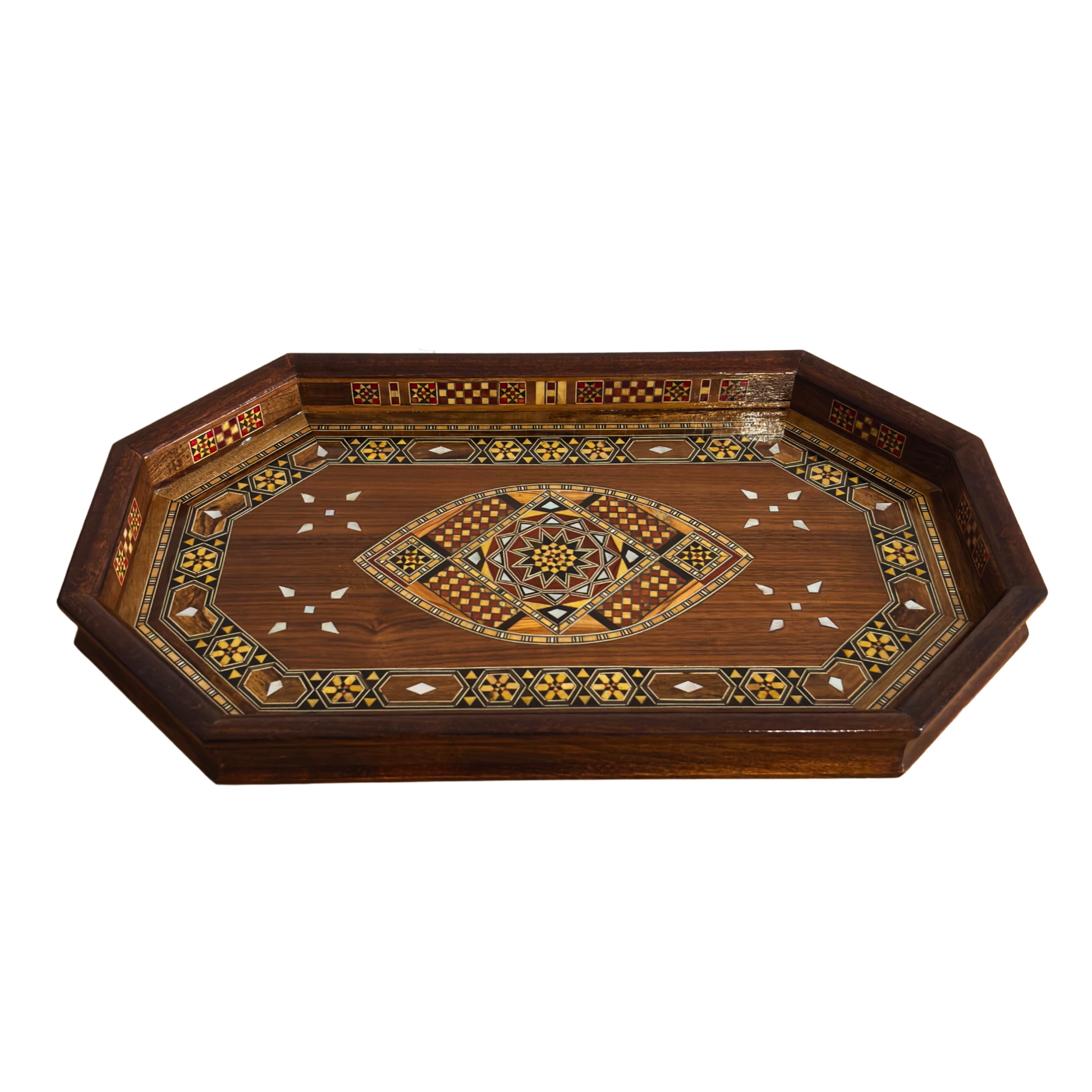 bandeja damasquina, madrepérola, design octogonal, acabamento em nogueira, arte síria, decoração artesanal, Damascus Box